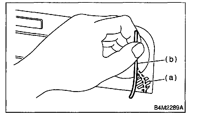 4. Firmly hold a thin thread (b) in front of the in-vehicle sensor suction port (a) for the auto A/C control unit and check that the thread moves towards the port indicating that air is being sucked into the port.