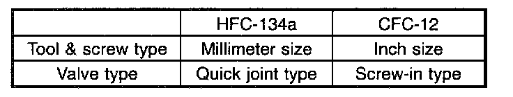 In order to help prevent mixing HFC-134a and CFC-12 parts and liquid, the tool and screw type and the type of service valves used are different. The gas leak detectors for the HFC-134a and CFC-12 systems must also not be interchanged.