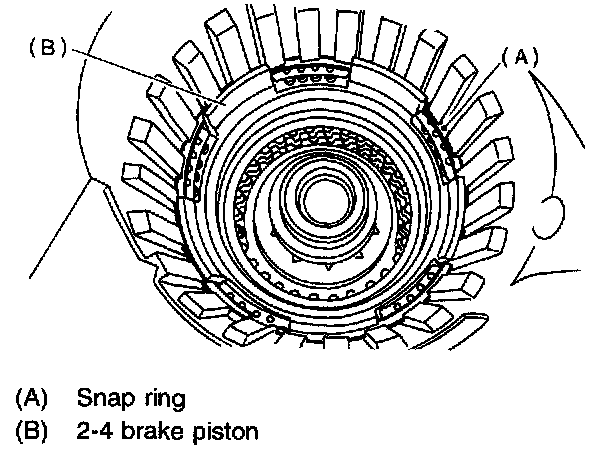 CAUTION: When removing the brake piston 2-4 and piston retainer, be careful not to rub or bump them against the transmission case.
