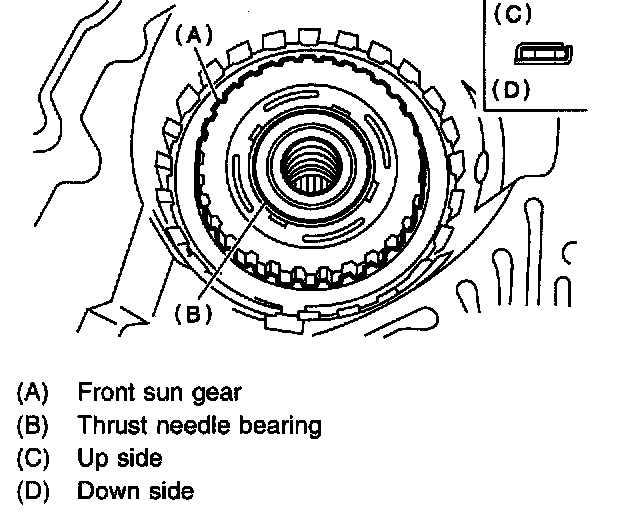 15) Install front sun gear and thrust needle bearing.