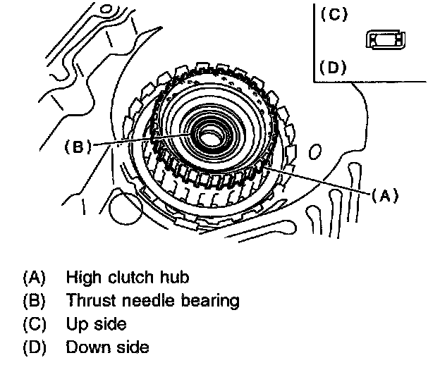 16) Install the high clutch hub and thrust needle bearing.