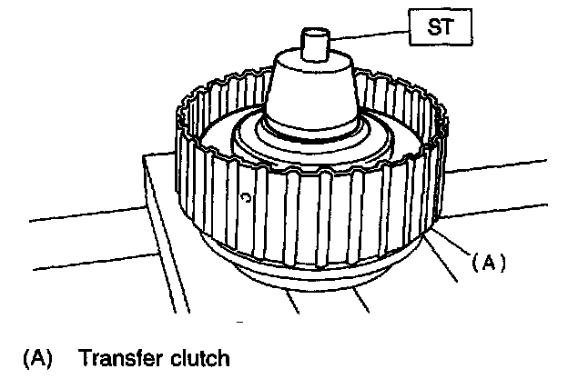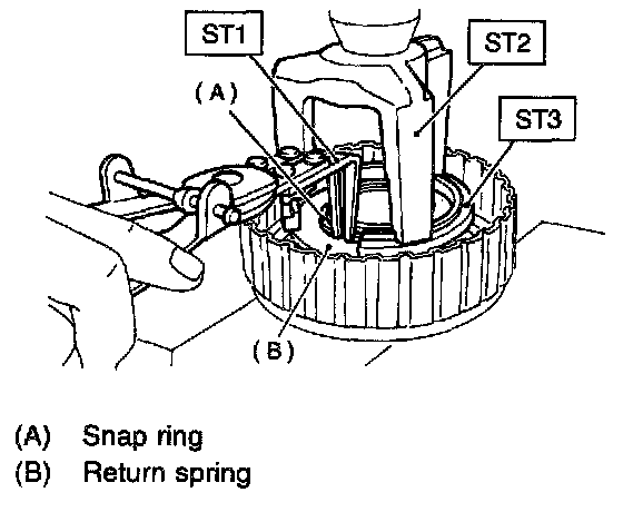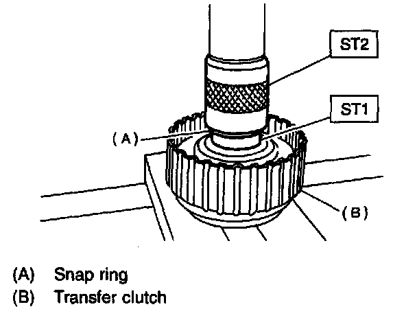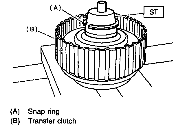 4) Remove the snap ring with ST1, ST2 and ST3, and take out the return spring and transfer clutch piston seal.