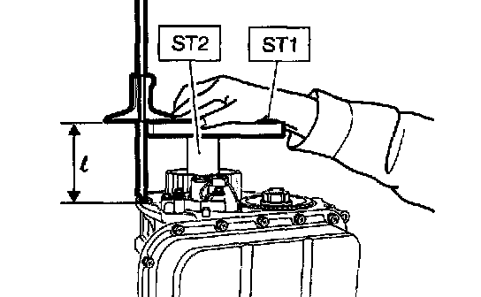 2) Measure the distance "l" from the transmission case mating surface to the reduction drive gear end surface with ST1 and ST2.