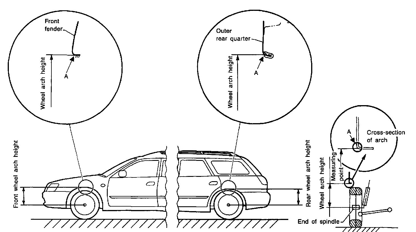 2. Mark rear sides of left and right tires at height corresponding to center of spindles and measure distance "A" between marks.