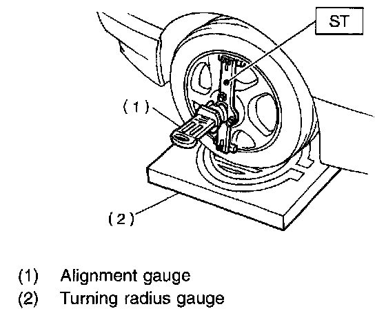 1. Place front wheel on turning radius gauge. Make sure ground contacting surfaces of front and rear wheels are set at the same height.