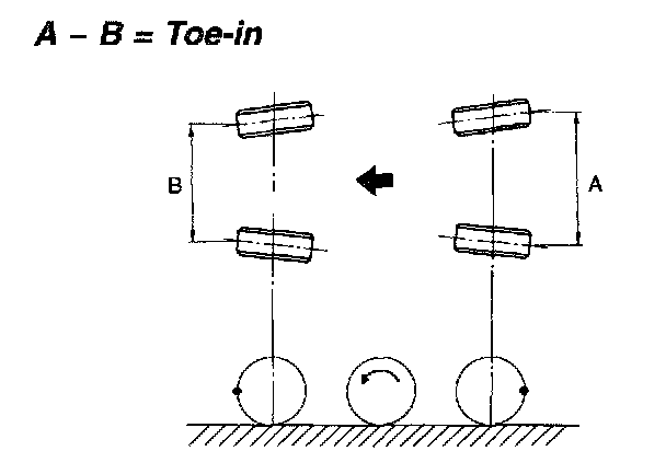 4. Measure distance "B" between left and right marks. Toe-in can then be obtained by the following equation: