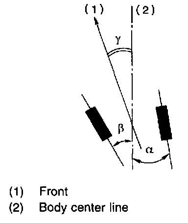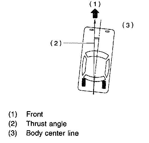 NOTE: Thrust angle refers to a mean value of left and right rear wheel toe angles in relation to vehicle body center line. Vehicle is driven straight in the thrust angle direction while swinging in the oblique direction depending on the degree of the mean thrust angle.