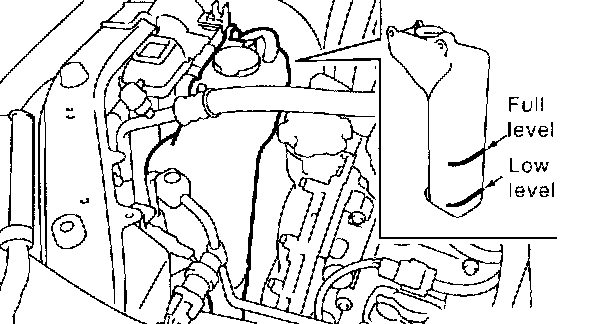 6. If engine coolant level drops from upper level of reservoir tank, add engine coolant to upper level.