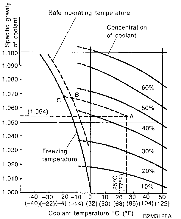 [Example] If the coolant temperature is 25°C (77°F) and its specific gravity is 1.054, the concentration is 35% (point A), the safe operating temperature is -14°C (7°F) (point B), and the freezing temperature is -20°C (-4°F) (point C).