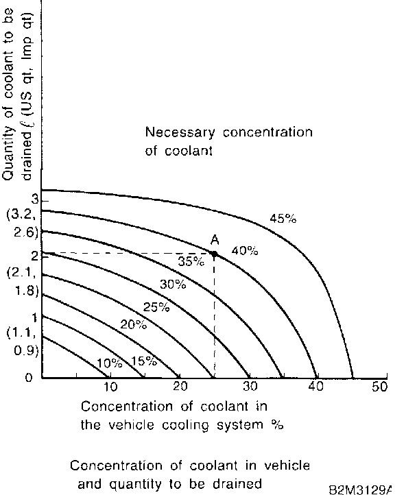Assume that the coolant concentration must be increased form 25% to 40%. Find point A, where the 25% line of coolant concentration intersects with the 40% curve of the necessary coolant concentration, and read the scale on the vertical axis of the graph at height A. The quantity of coolant to be drained is 2.1 liters (2.2 US qt., 1.8 Imp qt.). Drain 2.1 liters (2.2 US qt., 1.8 Imp qt.) of coolant from the cooling system and add 2.1 liters (2.2 US qt., 1.8 Imp qt.) of the undiluted solution of SUBARU coolant.