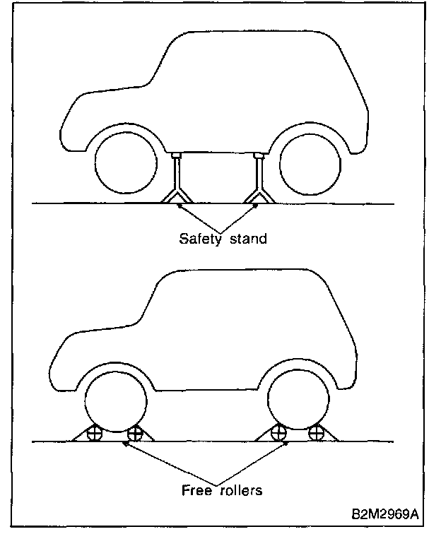 - In order to prevent the vehicle from slipping due to vibration, do not place any wooden blocks or similar items between the safety stands and the vehicle.
