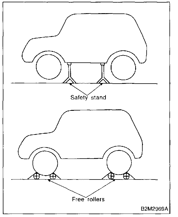 PREPARATION FOR THE INSPECTION MODERaise the vehicle using a garage jack and place on safety stands or drive the vehicle onto free rollers.