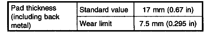 - A wear indicator is provided on the inner disc brake pad. If the pad wears down to such an extent that the end of the wear indicator contacts the disc rotor, a squeaking sound is produced as the wheel rotates. If this sound is heard, replace the pad.