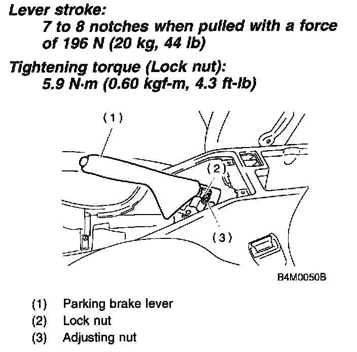 3. Adjust parking brake lever by turning adjuster until parking brake lever stroke is set at 6 notches with operating force of 196 N (20 kg. 44 lbs.).