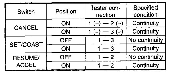 Check continuity between cruise control command switch terminals.