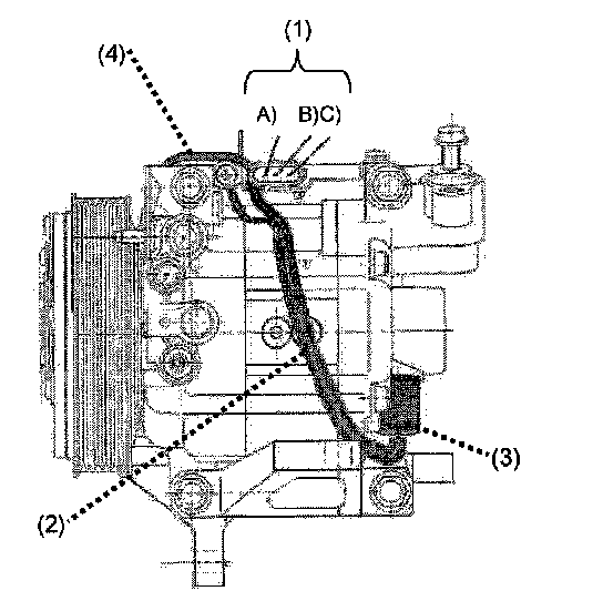 4) Remove the air conditioner compressor from the vehicle after installing the compressor plugs provided in the kit and applying electrical tape over the ends of the high and low side hoses. This will prevent dirt, dust, moisture, and other foreign material from contaminating the system.
