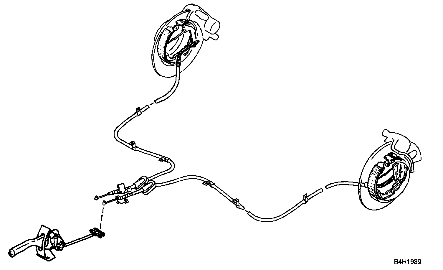 When the parking brake lever is returned to the release position and the parking brake cables are slackened, the brake shoes A and B are moved back to their original positions by the tension of return springs, so that the parking brake is released.