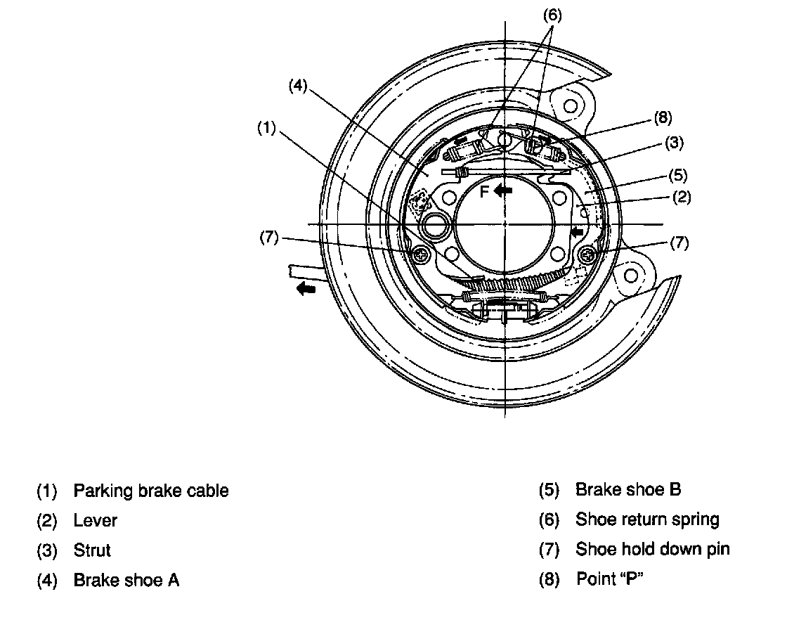 When the parking brake lever is pulled, the shoe actuating lever to which the end of the parking brake cable is connected turns the strut in direction "F" around point "P".