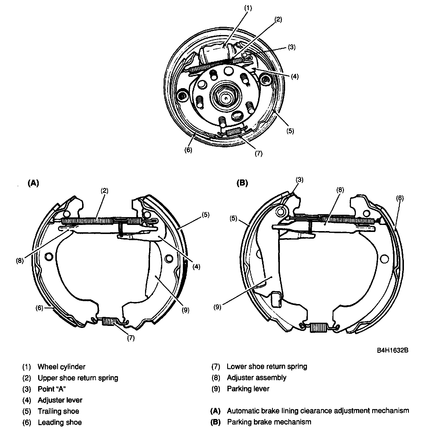 When the parking brake lever is moved up, the parking lever in each rear drum brake moves around point "A" so that the trailing shoe expands. The leading shoe also expands by way of the adjuster assembly. The shoes are thus pressed against the drum to generate a wheel locking force.