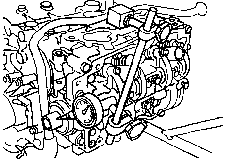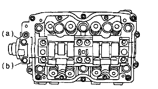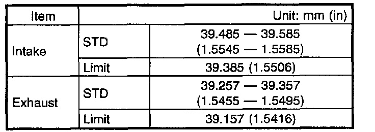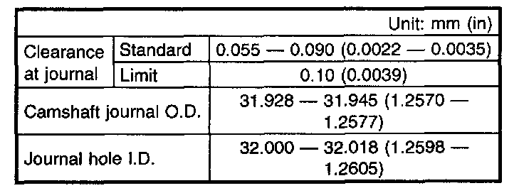 c) Measure outside diameter of camshaft journal and inside diameter of cylinder head journal, and determine the difference between the two (= oil clearance). If oil clearance exceeds specifications, replace camshaft or cylinder head as necessary.
