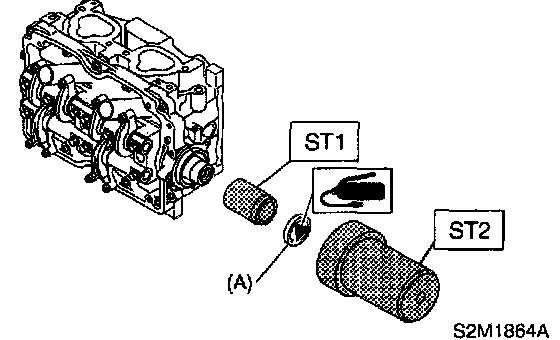 3) Apply a coat of grease to oil seal lips and install oil seal (A) on camshaft using ST1 and ST2.