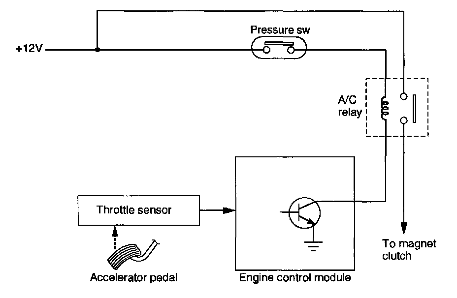 When the ECM receives a full-throttle signal from the throttle sensor during compressor operation, it deactivates the A/C relay to interrupt electric current to the compressor magnet clutch. This prevents the degradation of acceleration performance. The A/C relay is in the main fuse box located on the left side of the engine compartment.