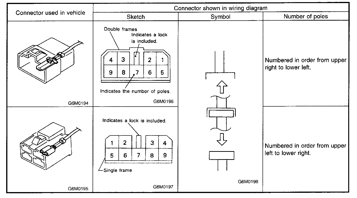 - The number of poles or pins, presence of a lock, and pin number of each terminal are indicated in the sketch of each connector. In the sketch, the highest pole number refers to the number of poles which the connector has. For example the sketch of the connector shown in figure indicates the connector has 9 poles.