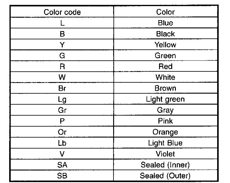 - The wire color code, which consists of two letters (or three letters including Br or Lg), indicates the standard color (base color of the wire covering) by its first letter and the stripe marking by its second letter.