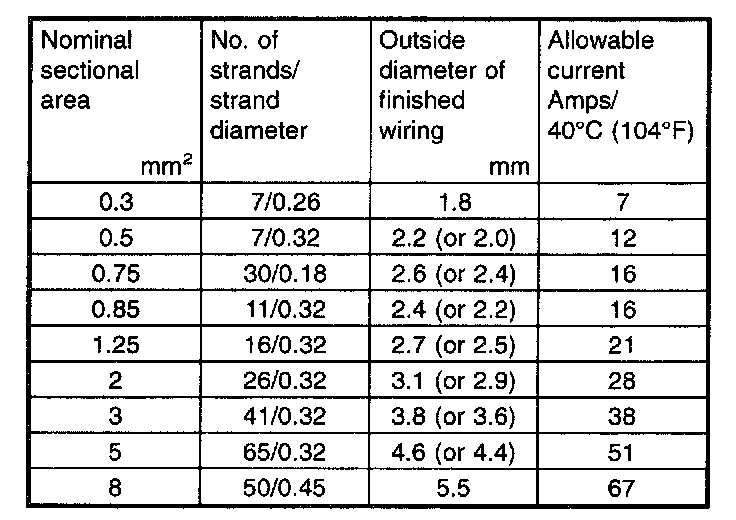 - The table lists the nominal sectional areas and allowable currents of the wires.