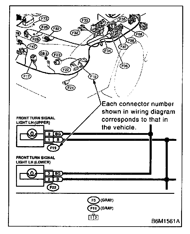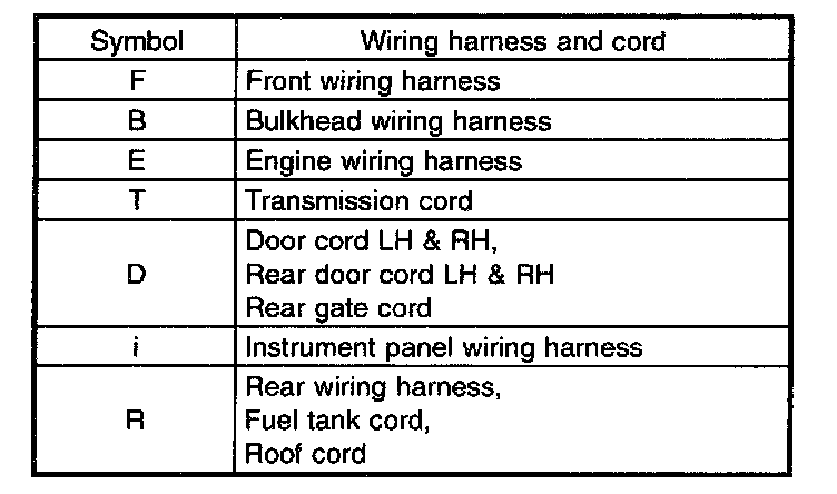 - Each connector number shown in the wiring diagram corresponds to that in the wiring harness. The location of each connector in the actual vehicle is determined by reading the first character of the connector (for example, a "F" for F8, "i" for i16, etc.) and the type of wiring harness.