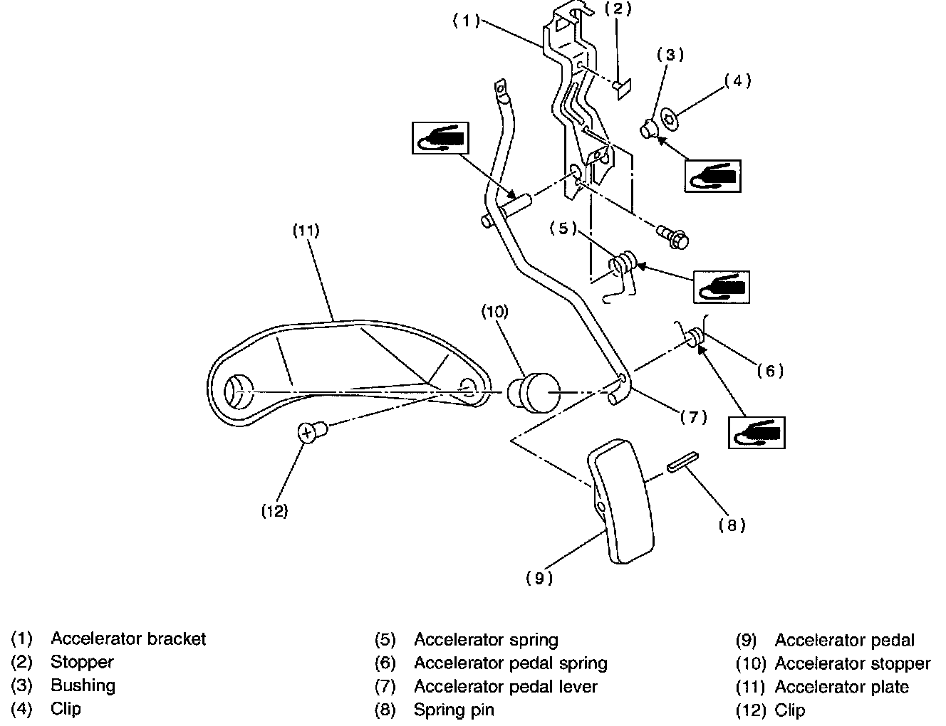 1) Remove the clip, and then remove the accelerator pedal from the bracket.