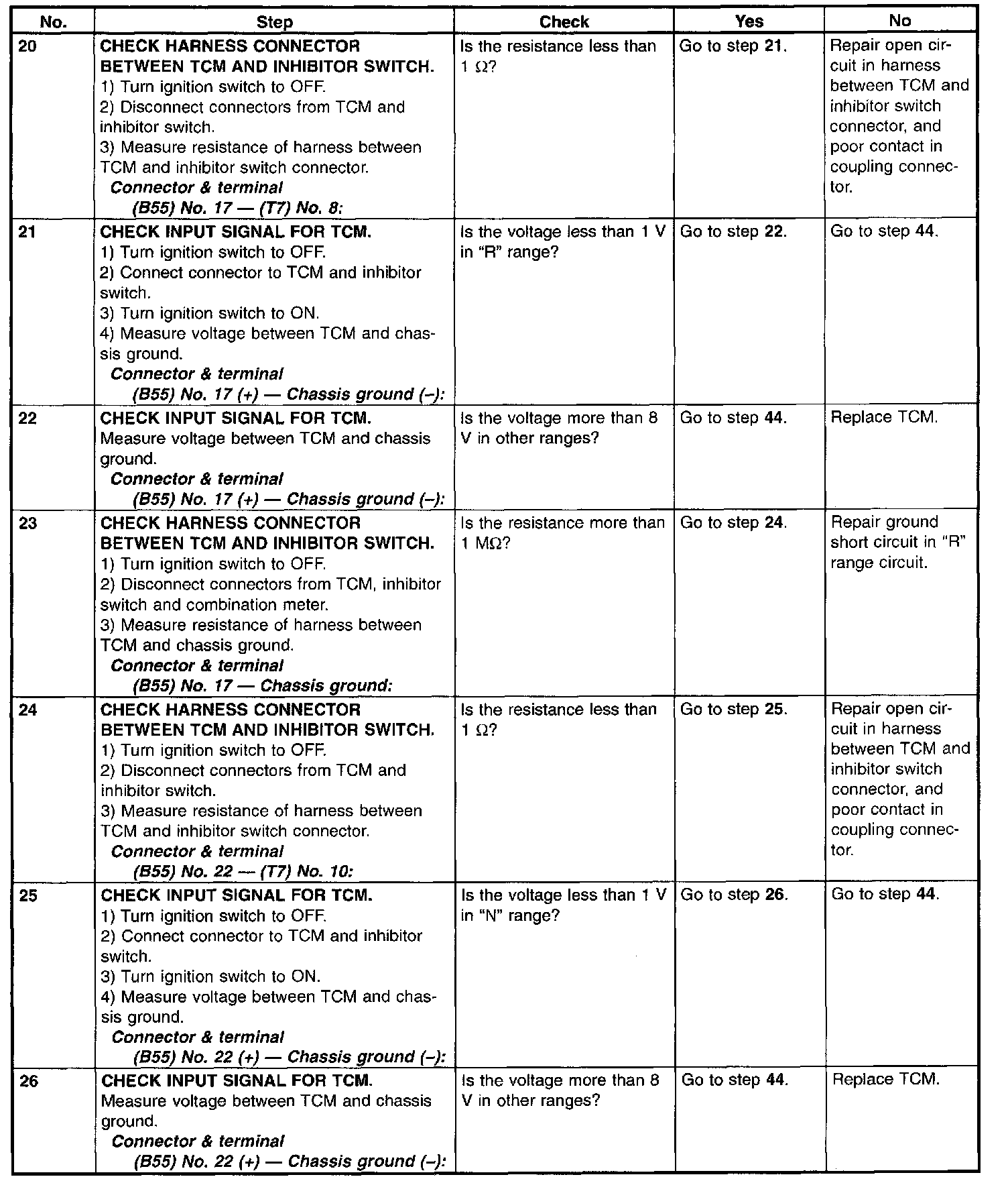 Input signal circuit of inhibitor switch is open or shorted.