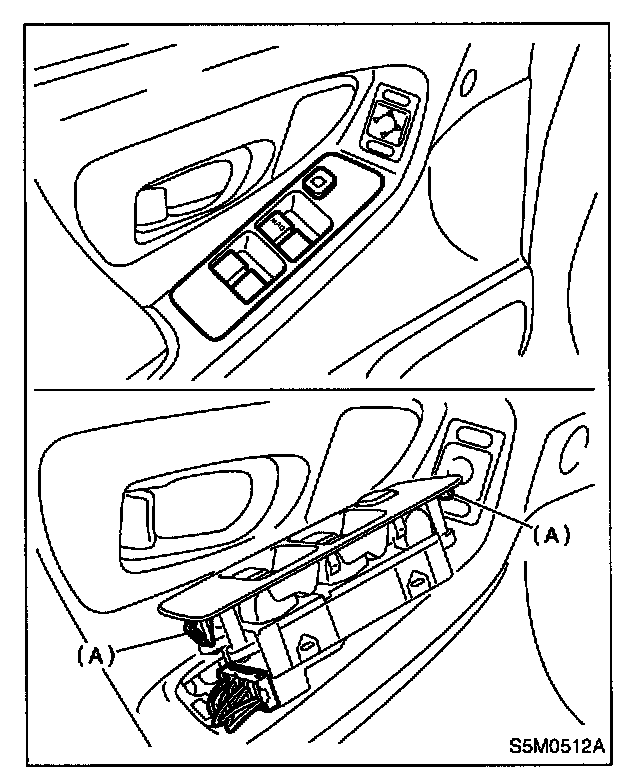 1. Release two hooks (A) of switch panel to remove power window main switch.