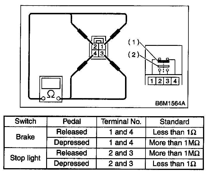 Measure the brake switch (1) and stop light switch (2) resistance.
