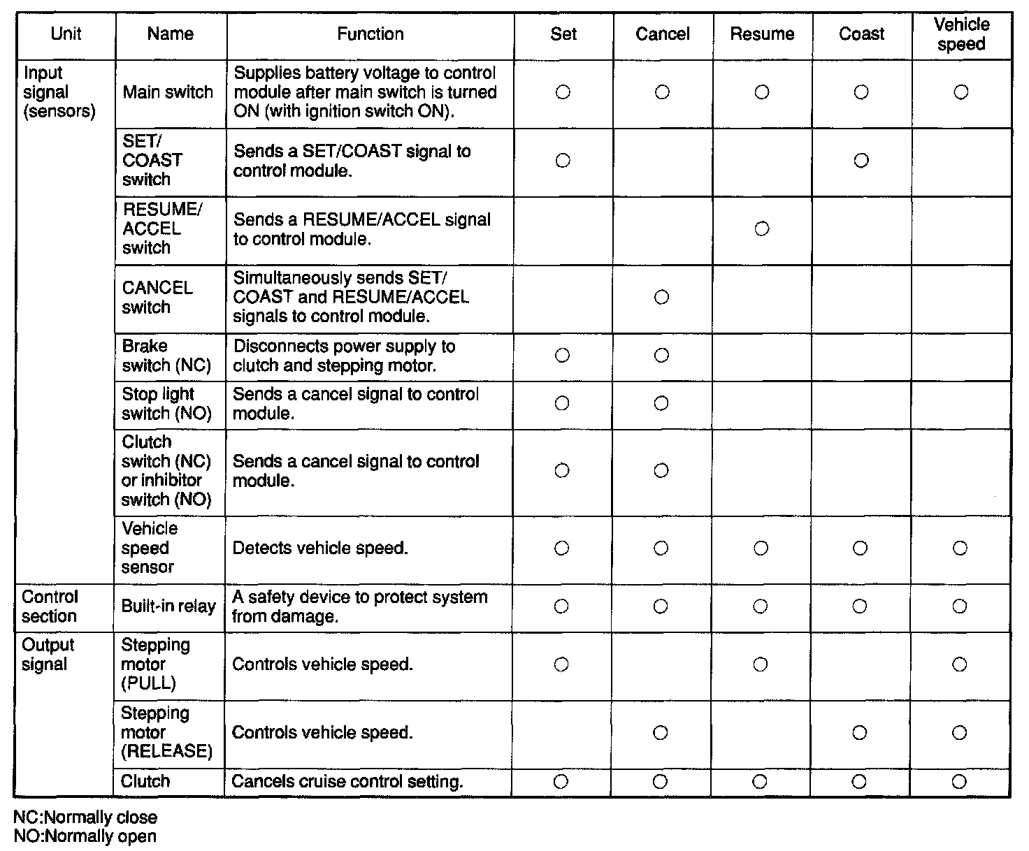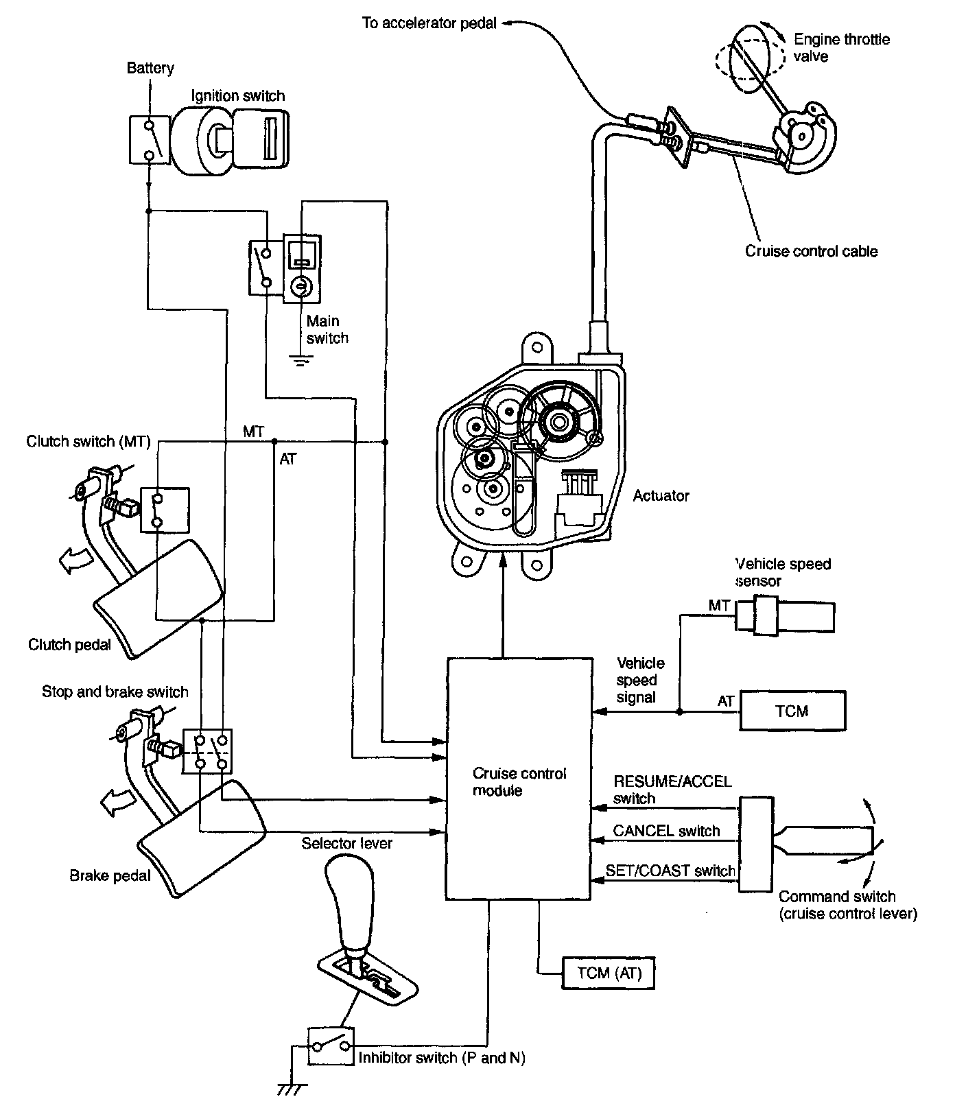 - When the driver has activated the system and made a desired speed setting, the cruise control module compares the actual vehicle speed detected by the speed sensor (MT) or transmission control module (AT) with the preset speed in the memory, then generates a signal according to the difference between the two speeds.