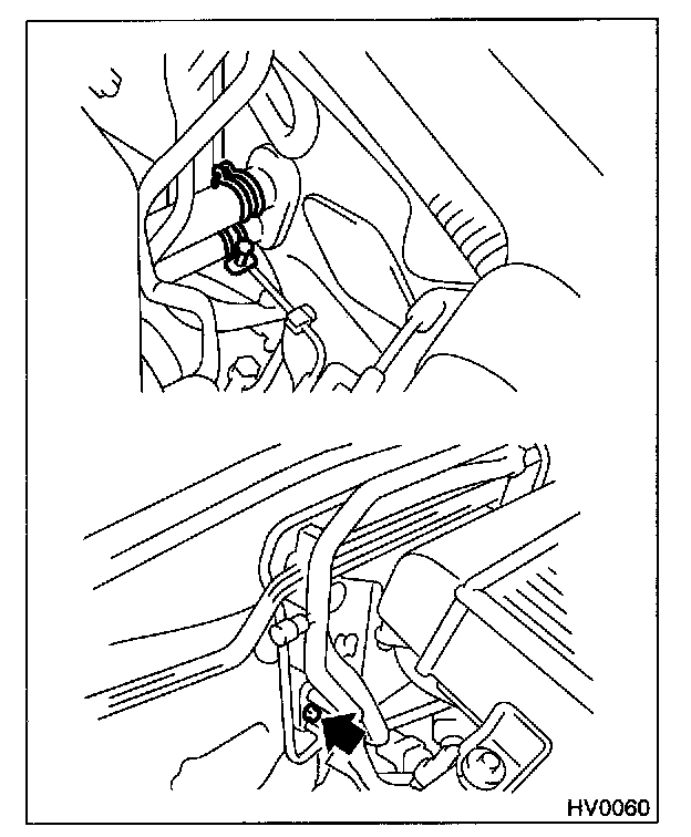 4. Remove the bolts securing expansion valve and pipe in engine compartment. Release the heater hose clamps in engine compartment to remove the hoses.