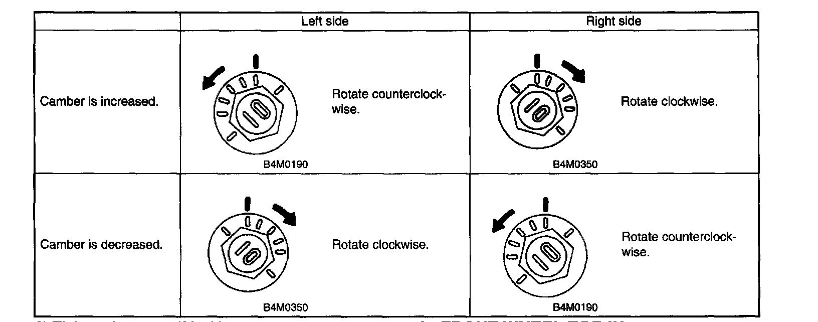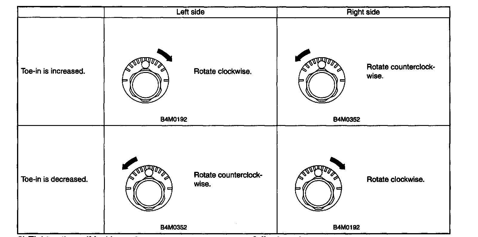 2. When one rear wheel is adjusted in a toe-in direction, adjust the other rear wheel equally in toe out direction, in order to make the thrust angle adjustment.