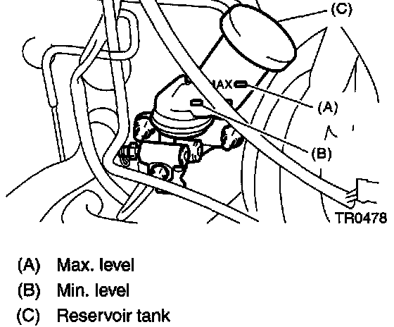 2. Inspect the fluid level using the scale on the outside of the reservoir tank. If the level is below "MIN", add fluid to bring it up to "MAX", and also inspect for leakage.