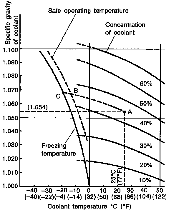 If the coolant temperature is 25°C (77°F) and its specific gravity is 1.054, the concentration is 35% (point A), the safe operating temperature is -14°C (7°F) (point B), and the freezing temperature is -20°C (-4°F) (point C).