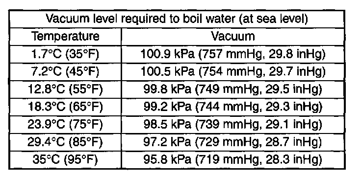 - The list shows the vacuum values necessary to boil water in various temperature. In addition, the vacuum levels indicated on the gauge are approx. 3.3 kPa (25 mmHg, 0.98 in Hg) lower than those measured at 304.8 m (1,000 ft) above sea level.