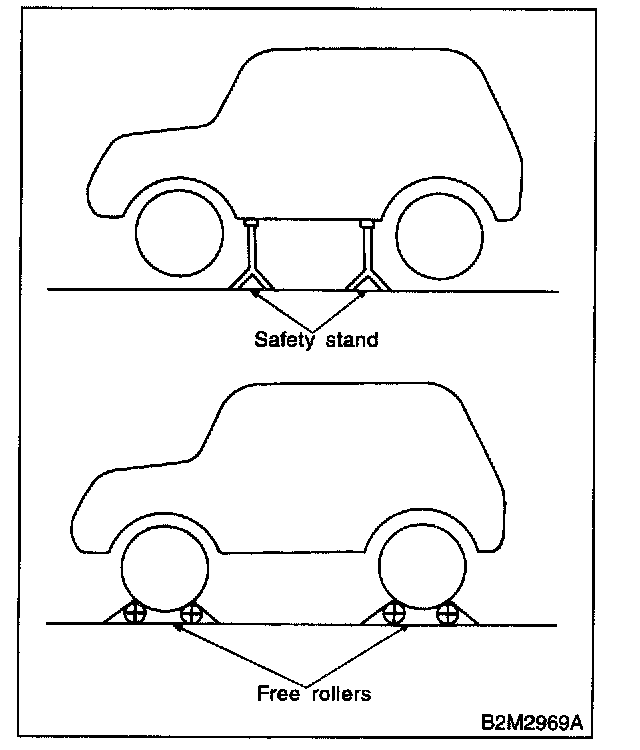 PREPARATION FOR THE INSPECTION MODERaise the vehicle using a garage jack and place on safety stands or drive the vehicle onto free rollers.