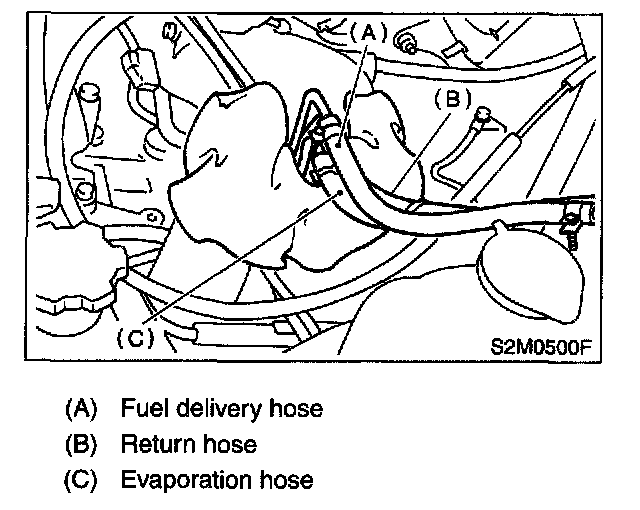 6. In engine compartment, detach the fuel delivery hoses, return hoses and evaporation hose
