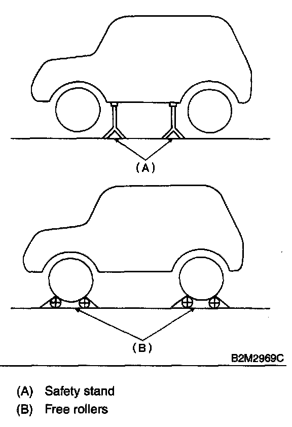 A: OPERATIONRaise the vehicle using a garage jack and place on safety stands or drive the vehicle onto free rollers.