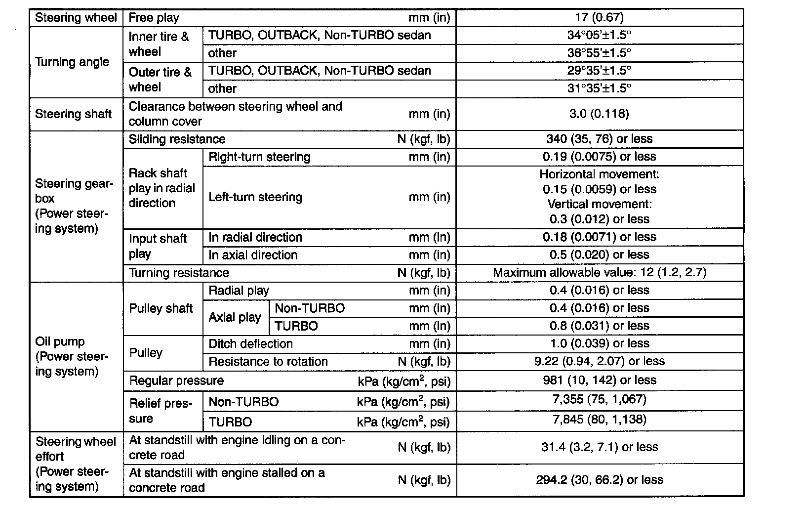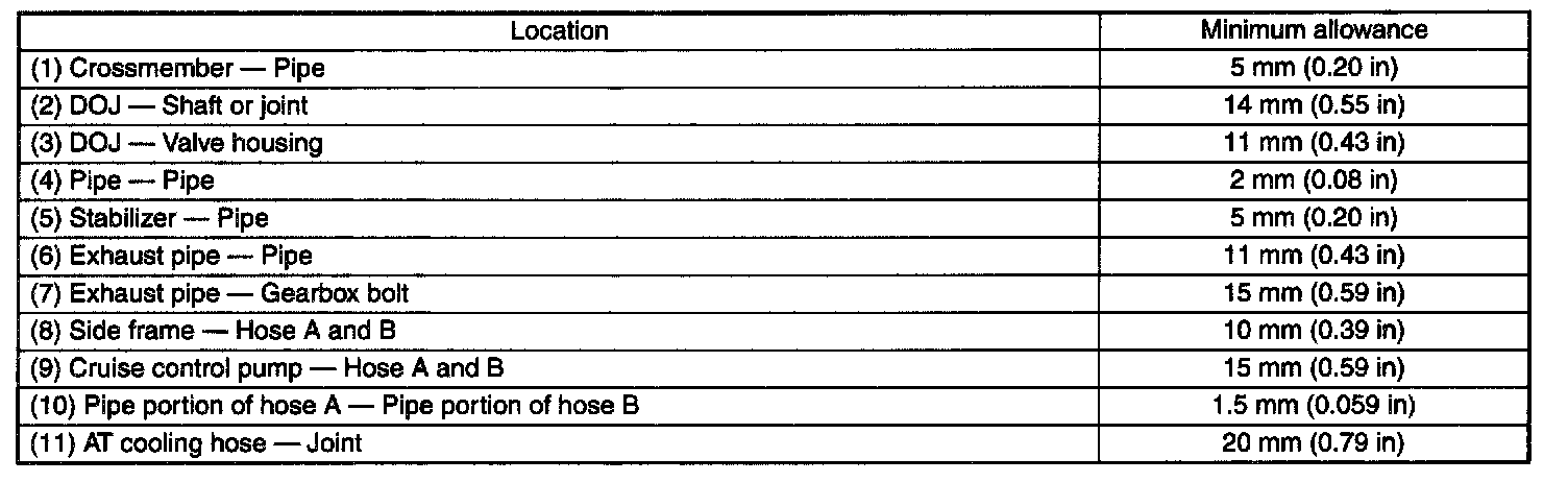 This table lists various clearances that must be correctly adjusted to ensure normal vehicle driving without interfering noise, or any other faults.