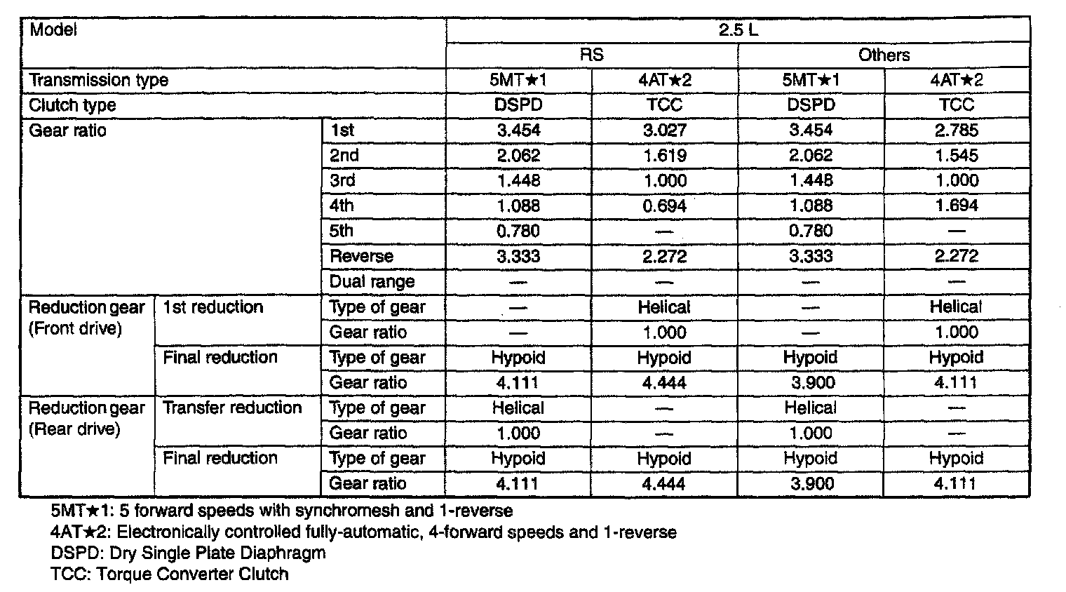 5-spd M/T/4-spd A/T, Transmission/Reduction Gear Ratios (2.5L):