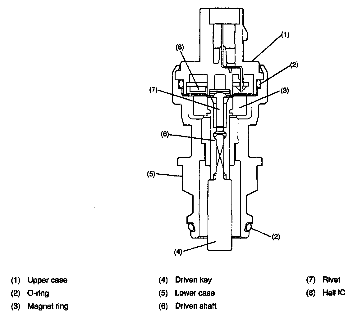 The speed sensor mainly consists of a Hall IC, magnet ring, driven shaft and spring.