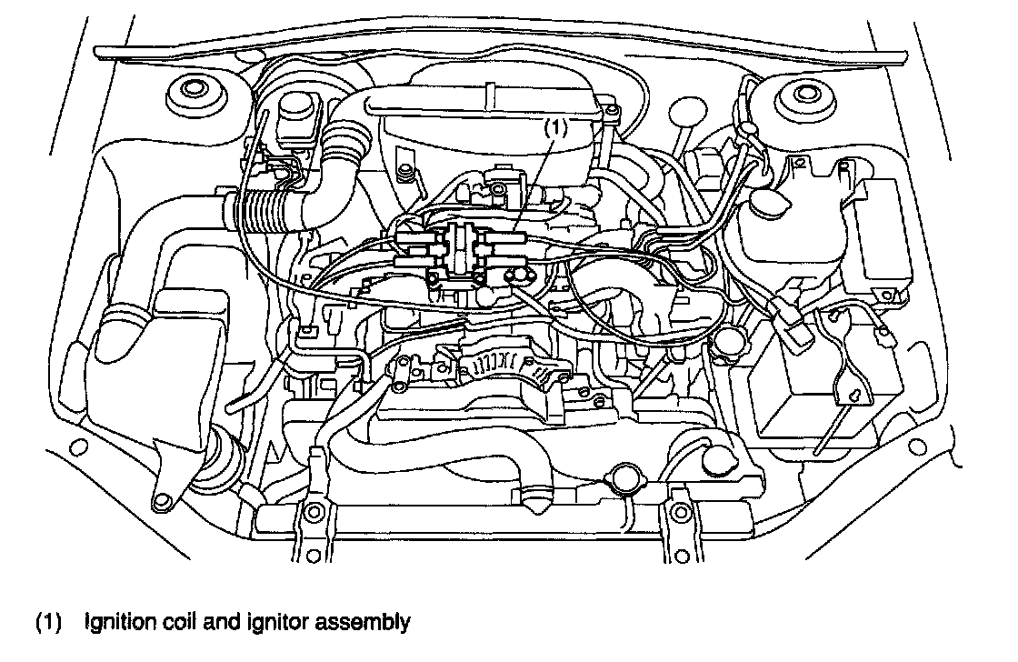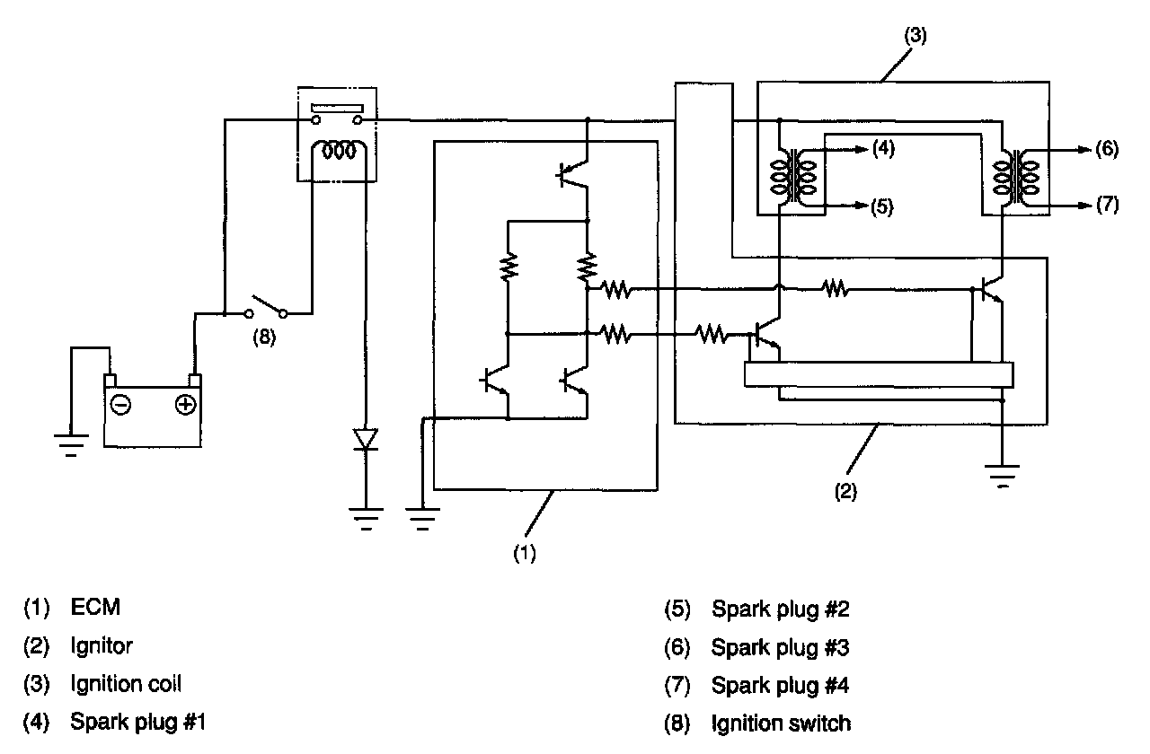 Ignition coils are made integral with an ignitor.The ignition system is of a dual-ignition-coil design, each coil causing two plugs to generate sparks simultaneously. In response to the signal from the ECM, the ignitor supplies current to an ignition coil and the ignition coil supplies high-voltage current to a pair of spark plugs (#1 and #2 or #3 and #4) simultaneously.