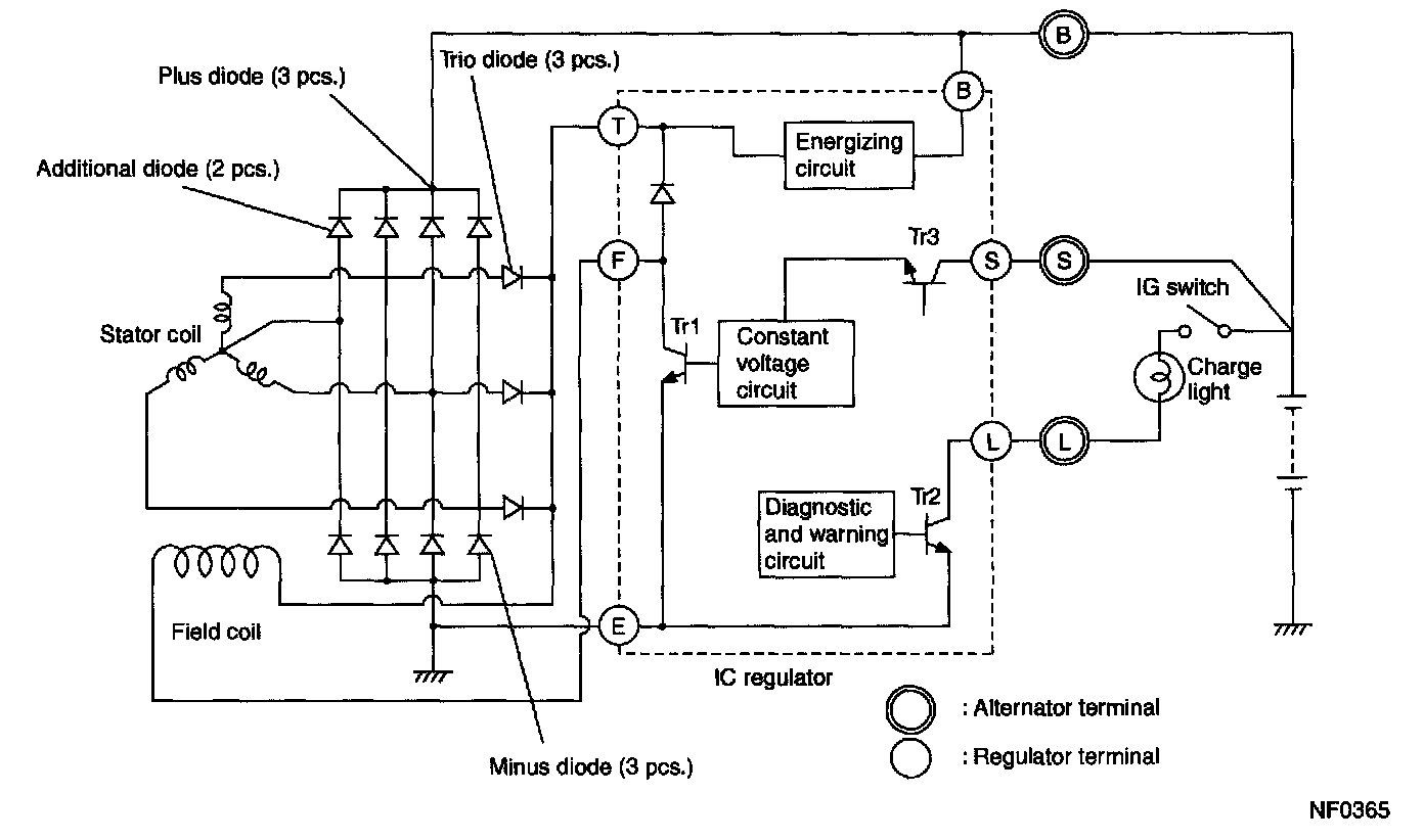 The generator has a built-in regulator which provides diagnostic functions in addition to a voltage regulating function as follows: