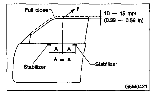 3. Lower the door glass 10 - 15 mm (0.39 - 0.59 in) from fully closed position. While applying outward pressure of 45.0 ± 4.9 N (4.6 ± 0.5 kg, 11.0 ± 1.1 lb) (F) to upper edge of glass above midpoint of two outer stabilizers, press the inner stabilizer at pressure of 10 ± 5 N (1.0 ± 0.5 kg, 0.2 ± 0.1 lb) to the glass, then secure it.