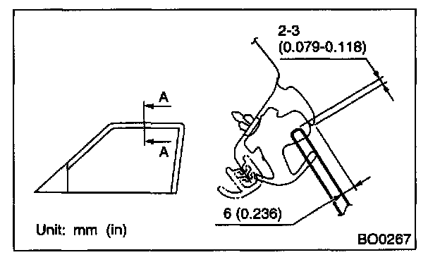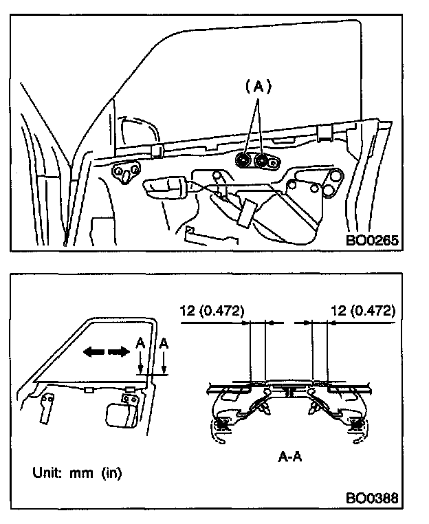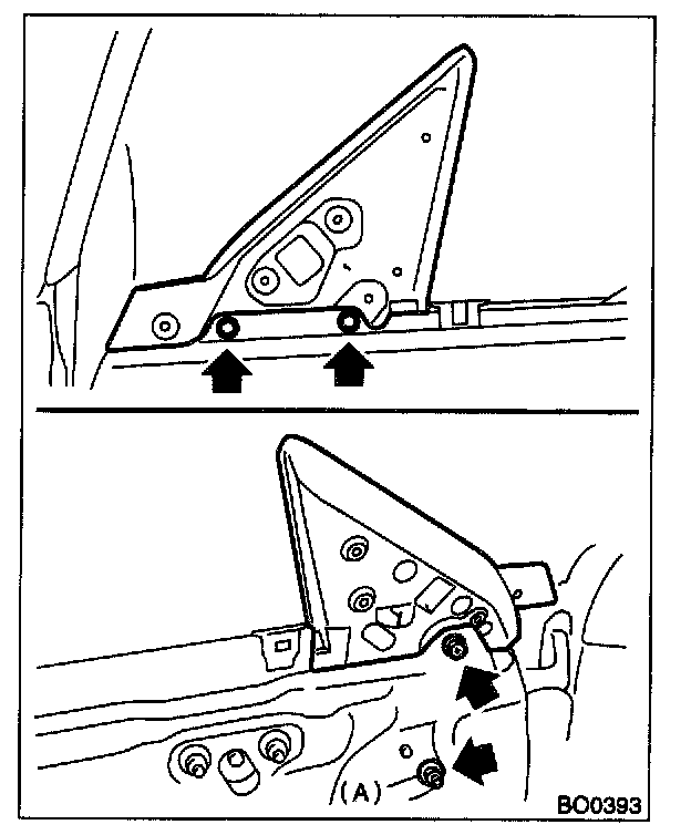 12. After adjustment of glass, if there is a gap between outer lip of gusset and glass surface, adjust the gap with adjusting bolt (A) in lower fitting part of gusset to prevent generation of wind noise.